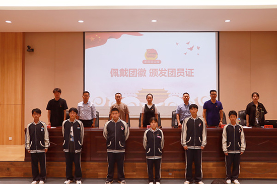 郭海英、蔡其標、汪光岳、金松、王金偉、李若鋌為新團員代表佩戴團徽、頒發團員證,標志著他們正式成為共青團員。