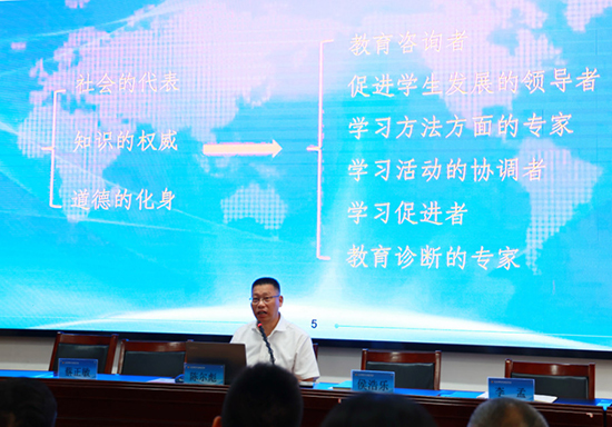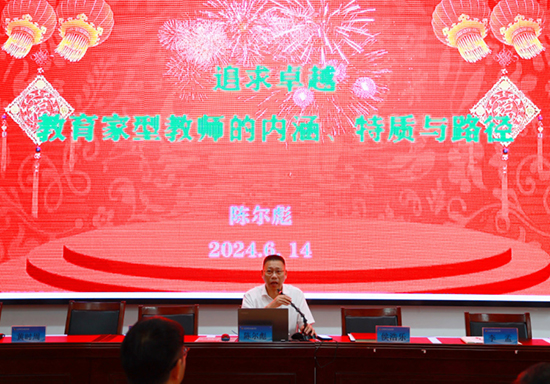 校長陳爾彪作《追求卓越——教育家型教師內涵、特質與路徑》的講座。百年大計,教育為本。教師是立教之本,興教之源。陳校長圍繞當前發展趨勢,指出教育家型教師既是教師專業發展邊界的突破,也是教師隊伍建設的未來指向。作為教育家型教師,應堅持六大核心要義,立根立德立業立學立魂立志;應具備教育理想、教師知識、實踐能力、發展訴求及教育影響的基本素養。同時,基于以上內涵和特質,陳校長提出成為教育家型教師的具體路徑,并提供了切實可行的專業成長規劃。