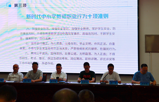 副校長李孟為全體教師解讀《新時代中小學教師職業行為十項準則》,并結合學校實際,要求全體教師對照準則自查自糾,檢視自身教育行為,做到知準則、明要求、守底線,恪守師德。