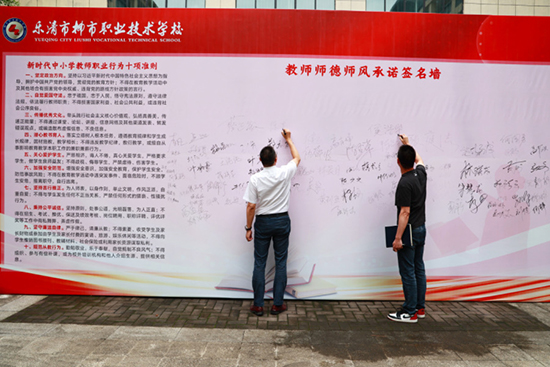 最后,全體教師移步至師德師風承諾墻簽名,鄭重承諾接受全體學生、家長與社會的監督,牢記使命,愛崗敬業,自覺遵守師德師風相關規定。