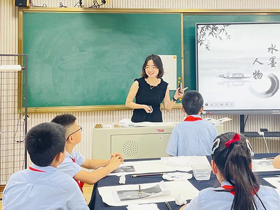 來自陳勇名師團隊的王亞圣、丁玲、顧韻赟三位老師,以國畫為主題大單元展示了《奇石》《彩墨游戲》《水墨人物》的三節課例,課后,陳勇老師從國畫的內容、墨色、用筆、形式、風格、畫家及其思想等國畫單元教學的梳理進行針對性點評。參訓教師對當下美術教材國畫內容中呈現的關注基本知識、技能的共性規律和遷移、系統思維和核心素養的目標達成進行了充分交流。