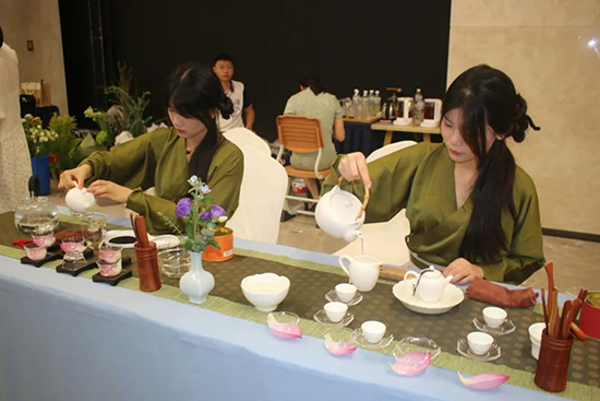 在古色古香的現(xiàn)代服務(wù)學(xué)院展區(qū),同學(xué)們現(xiàn)場(chǎng)展示了泡茶與插花的技藝,手法嫻熟而優(yōu)雅,茶香四溢,花香撲鼻,將大家?guī)肓艘粋€(gè)寧靜而美好的空間。