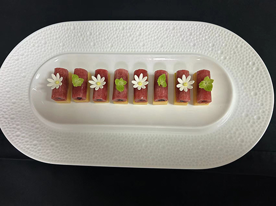 水蜜桃楊梅卷的研發,不僅是校企雙方智慧與創意的結晶,更是兩地食材文化的一次精彩碰撞。在鮑佶杖老師和謝錡導師的精心指導下,這款甜點不僅在選材上嚴格把關,更在制作工藝上精益求精,力求將每一道細節都做到極致。其色澤鮮艷的外觀、酸甜可口的味道,讓人在品嘗的同時也能感受到夏日里的一絲清涼。