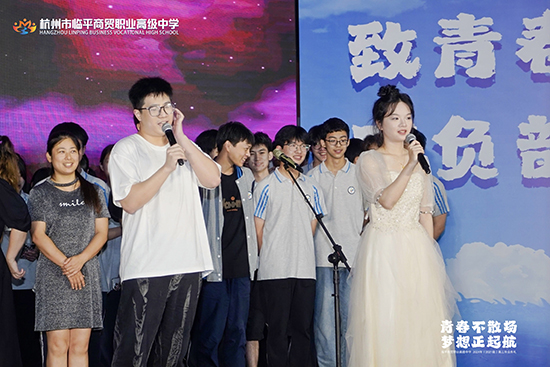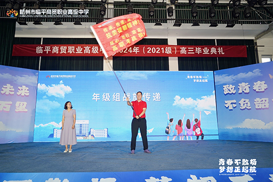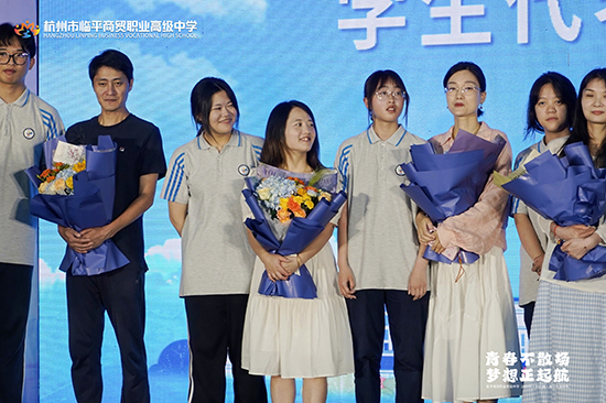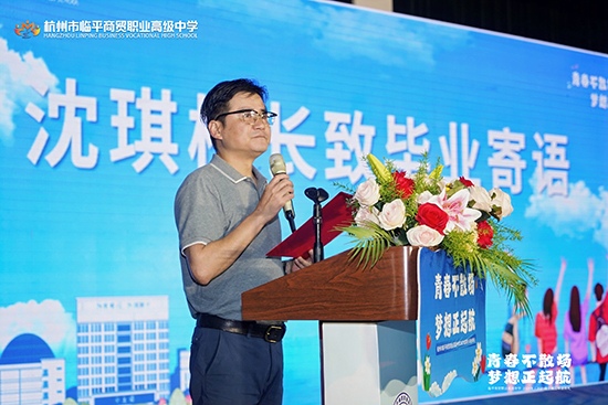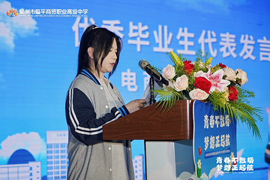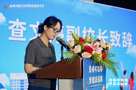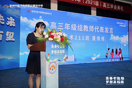 教學副校長查文婷致辭,她首先向2021級學子表達祝賀,祝賀2021級學子順利畢業,祝賀他們取得的豐碩成果:591人圓夢大學,上線100%;本科人數繼續保持兩位數高位發展,所有專業大類均有本科上線;電商專業本科人數連續三年位列杭州市第一,藝術設計類專業本科人數位列全省第十名。隨后感謝辛勤耕耘、一路奉獻的全體高三班主任、任課教師及所有教職員工,感謝執著夢想與無悔拼搏的全體高三學子,感謝他們在青春燦爛的年華,與學校一起攜手同行!最后,查文婷副校長為全體畢業生生送上真摯的祝福,同時宣布典禮正式開始。