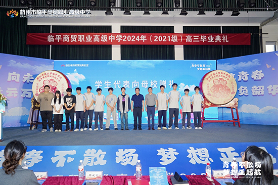 校園中的一草一木,一花一鳥,伴我們擺脫稚氣,走向沉穩,收獲知識,是學校為我們提供了學習的機會和平臺。離別之際,2021級學子王治仁、徐昱庭、朱笑天等370名同學捐資購買了一對大鼓,作為畢業禮物送給學校,祝福學校“鼓樂和鳴,越來越好”!沈琪校長、邵曉舟書記代表接收禮物并敲響第一聲鼓樂。