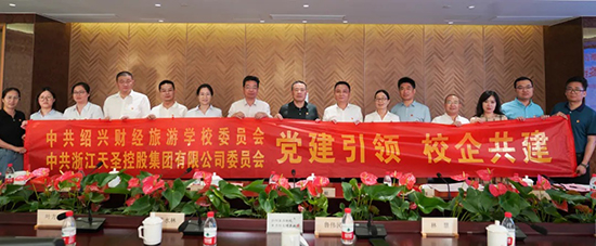 為推動黨建共建工作,構建資源共享、優勢互補的黨建工作新格局,7月4日下午,紹興財經旅游學校黨委書記魯偉民帶領全體黨委班子、各專業部黨支部書記赴浙江天圣控股集團有限公司進行黨建共建事宜,浙江天圣控股集團有限公司黨委書記、董事長孫永根,集團黨委副書記、工會主席吳晶瑾,集團人力資源部經理蕭燕鳳等相關領導共同出席了本次活動。