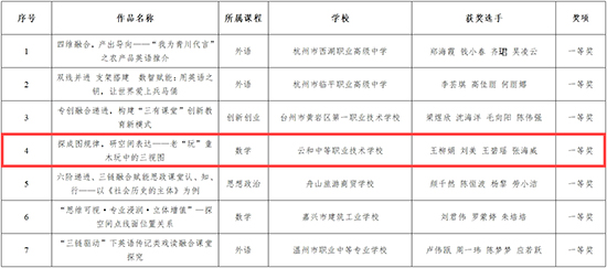 近日,2024年浙江省中等職業學校“多彩課堂”遴選活動結果揭曉,云和縣中等職業技術學校王柳娟、劉美、王碧瑤和張海威四位教師的參賽作品《探成圖規律,研空間表達——老“玩”童木玩中的三視圖》 榮獲省一等獎,實現了麗水市多彩課堂省一等獎零的突破!