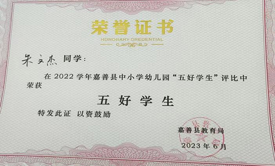在校期間,朱文杰光榮地成為了一名共青團員,獲得了2022-2023學年度中等職業(yè)教育國家獎學金,縣級五好學生等榮譽。