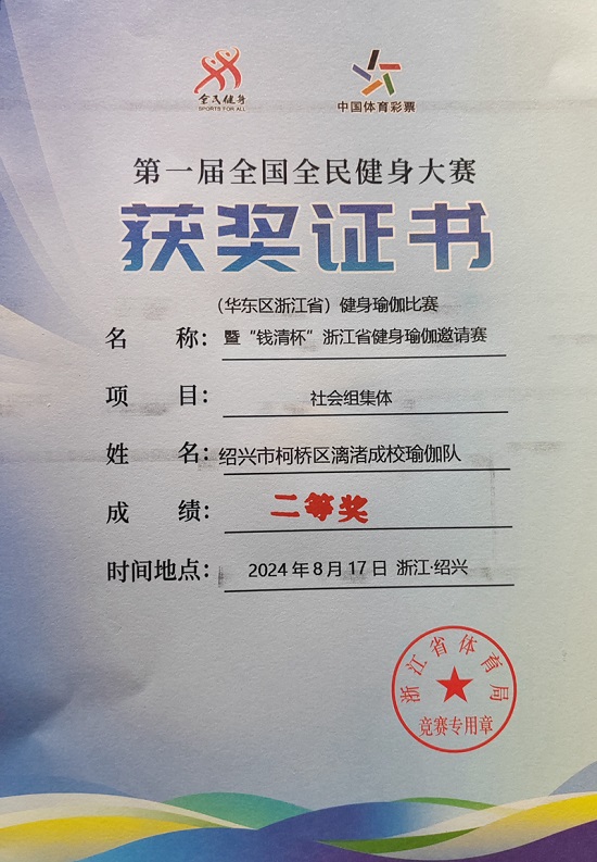 8月16日至18日,第一屆全國全民健身大賽(華東區(qū)浙江省)健身瑜伽比賽暨浙江省健身瑜伽邀請賽在紹興市柯橋區(qū)錢清街道舉行,賽事吸引來自華東地區(qū)各省、市的23支隊伍參加。柯橋區(qū)漓渚成校瑜伽隊參賽榮獲集體項目二等獎。