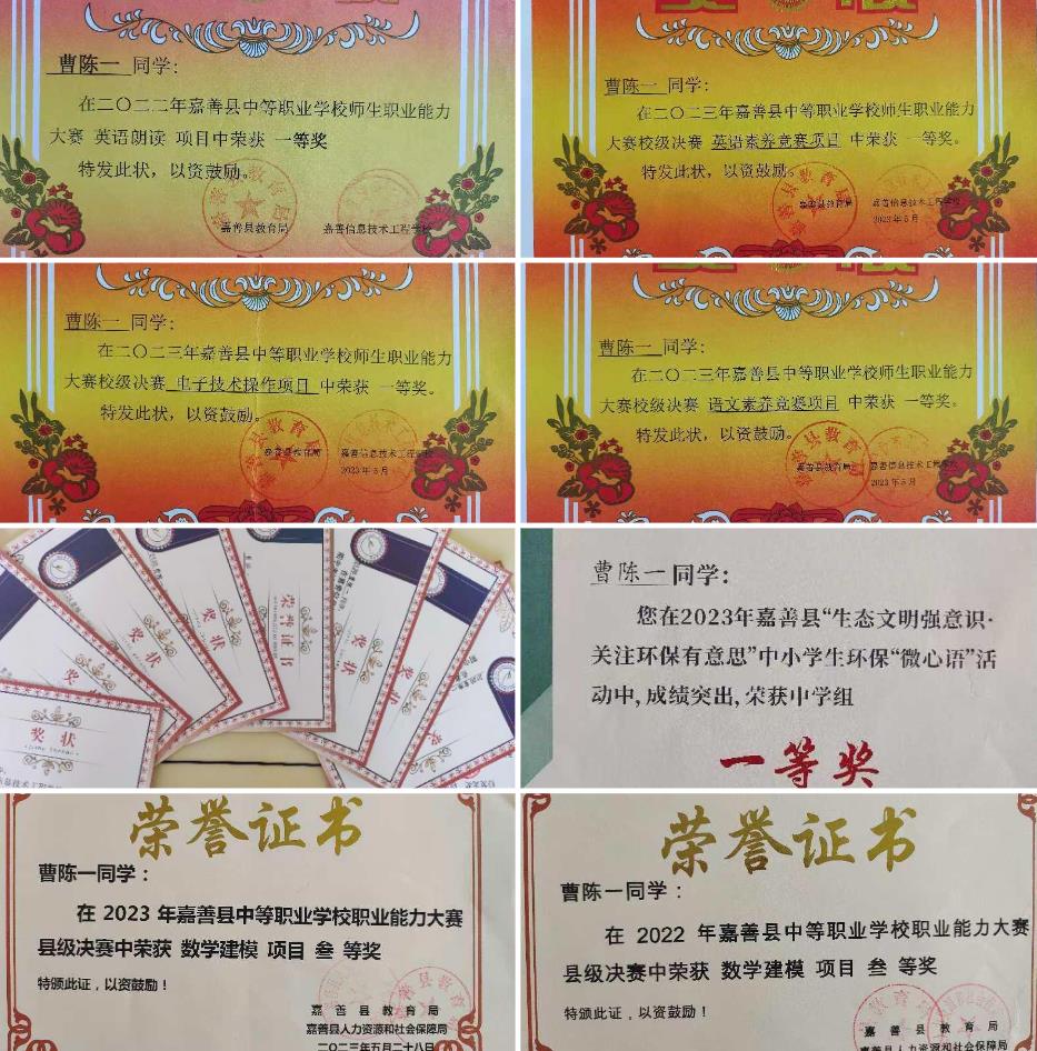 三年來,除了在學(xué)習(xí)上,曹陳一不放過任何提升自我的機(jī)會,在很多舞臺上都能看到他的身影。他積極參與各類活動,在縣環(huán)保“微心語”優(yōu)秀作品評比、英語朗誦、數(shù)學(xué)建模、電子小制作等比賽中榮獲佳績,年年被評為“學(xué)習(xí)標(biāo)兵”,深受老師和同學(xué)們的喜愛。