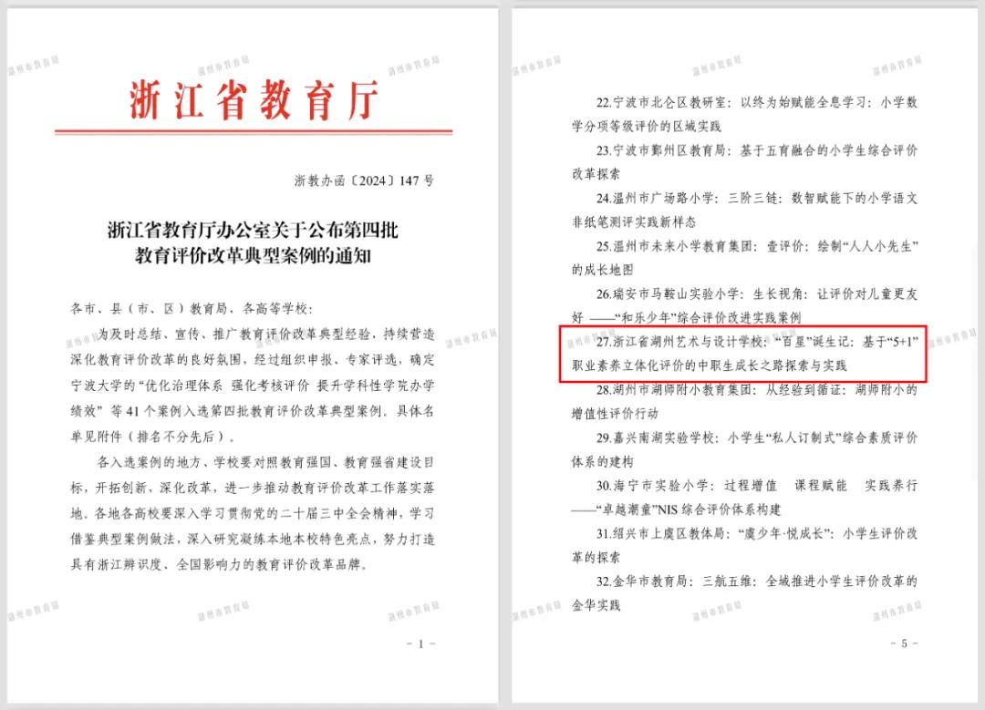 近日,浙江省教育廳辦公室公布第四批教育評價改革典型案例,浙江省湖州藝術與設計學校報送的案例《“百星”誕生記:基于“5+1” 職業素養立體化評價的中職生成長之路探索與實踐》成功入選,也是本次全省唯一入選的中職學校教育評價改革典型案例。