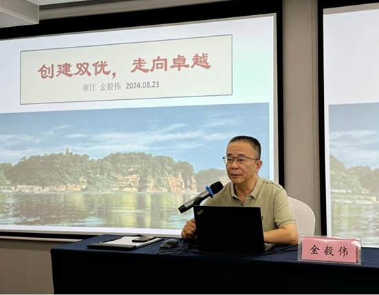 8月23日下午,學校特邀請湖州市教育局原副局長、湖州職業技術學院原黨委副書記金毅偉開展題為《創建雙優 走向卓越》的專題講座。金毅偉圍繞“推進雙高迭代發展創雙優、完善現代職教體系創雙優、錨定辦學質量提高創雙優、勇于改革創新實踐建雙優”等四個方面剖析了“雙優”項目的核心價值與深遠意義。