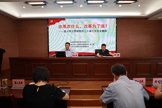 “作為一名農(nóng)民的兒子,我深切地感受到了改革帶來的變化……”8月29日下午,全國基層理論宣講先進(jìn)個人、浙江省十大優(yōu)秀基層宣講員施小榮老師在開放大學(xué)長興學(xué)院8月份的主題黨日活動中進(jìn)行了題為《改革改什么,改革為了誰——深入學(xué)習(xí)貫徹黨的二十屆三中全會精神》的講座,活動由學(xué)院副書記、院長金曙主持,全體黨員參加了本次活動。