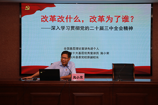 施老師從7月15日至18日召開的中國共產(chǎn)黨第二十屆中央委員會第三次全體會議的總體概況、充分肯定的工作成績、進(jìn)一步全面深化改革的總目標(biāo)和大會主題三個方面詳細(xì)展開,他用接地氣的語言,結(jié)合浙江的改革開放歷程和“八八戰(zhàn)略”的實施,列舉義烏小商品市場的發(fā)展、安吉余村的發(fā)展、長興和平鎮(zhèn)狄家斗村的故事,淺入深出地詮釋了《中共中央關(guān)于進(jìn)一步全面深化改革、推進(jìn)中國式現(xiàn)代化的決定》中的關(guān)鍵點,讓全體黨員深刻全面地了解到改革開放后中國在經(jīng)濟(jì)、科技、外交等方面取得的重大成果。