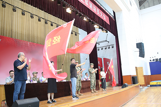 梁天軍、喻省喜、潘強分別向學校智能制造系、烹飪旅游系、經貿信息系授予夏令營旗幟。