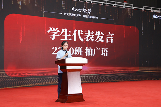生物醫藥部2210班柏廣語同學作為優秀學生代表上臺發言。她以夢想為主題,講述了她從學生會干部到專業技能提升,再到備戰本科考試的成長歷程。在挑戰中,她學會了堅持與不放棄。她堅信只要我們保持初心,勇于挑戰,就能實現夢想。