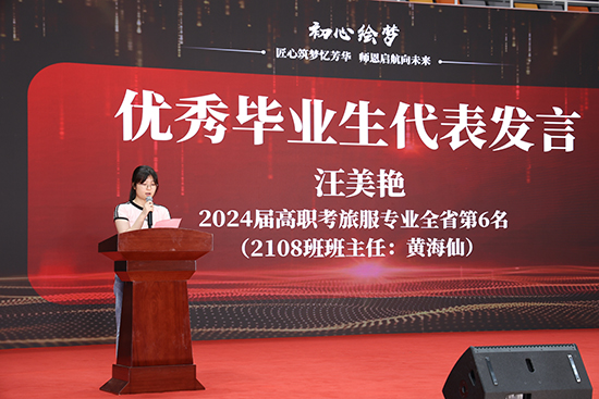 旅服專業2108班的汪美艷作為優秀畢業生代表發言,她回顧了自己臨職三年的美好時光,分享了自己從迷茫走向自信的經歷以及備戰高職考的酸甜苦辣。她鼓勵學弟學妹們,要懷抱對知識的熱情,不負眾望,追求更高的目標;要在實踐中不斷成長,在學習中不斷超越;要以切實的行動展現自己的實力,以積極向上的心態,勇敢地迎接未來的每一個挑戰。