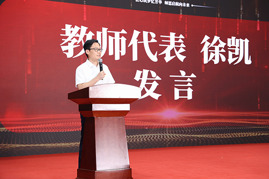 徐凱老師作為優秀教師代表發言,他深刻闡述了作為新時代職業教育工作者的使命與責任,他強調我們應當積極踐行教育家精神,致力于培育具備可持續發展能力的高素質、高技能人才,為我國新型生產力的提升貢獻堅實的人才基礎。在回顧自己的教育歷程時,徐老師分享了教育之路上的難忘瞬間、挑戰與困惑,通過他自己以及他的徒弟和學生的成長故事告訴我們,每個人都有自己的成長“時區”。徐老師堅信,每個孩子都是獨一無二的存在,我們要有啟智潤心、因材施教的育人智慧,努力發現并培養每個學生的特長與興趣,引導他們找到自己“時區”,讓每一位學生都能擁有出彩人生的機會。