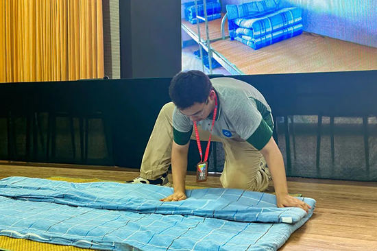 隨后,兩位老生代表為全體新生示范如何疊被,鋪平、壓實、翻折、摳角、捏線,一張整齊的“豆腐塊”被子呈現(xiàn)在大家面前。禹教官強調(diào),疊被是“三分疊、七分整”,每一處細節(jié)都尤為重要。這也使在場的每一位同學都醍醐灌頂,有所收獲。