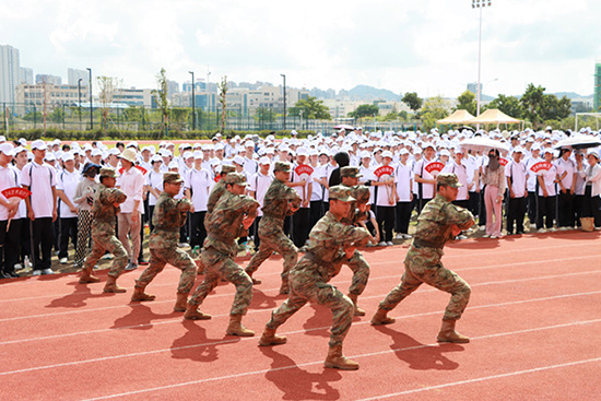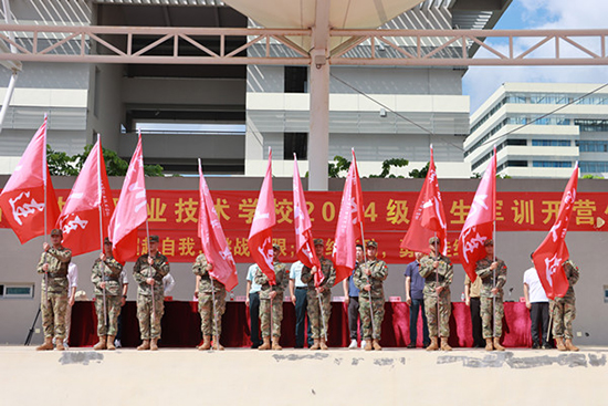 軍訓開營儀式上,教官代表們為全體新生帶來了精彩的軍事技能展示,他們整齊劃一的動作、鏗鏘有力的口令贏得了在場師生的陣陣掌聲。隨后,校級領導為各班級授軍訓營連旗,鮮艷的旗幟在晨風中飄揚,象征著新生們即將開啟為期一周的軍訓之旅。
