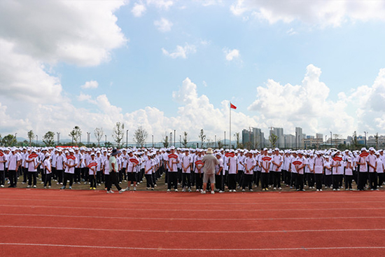 隨著激昂的《義勇軍進行曲》響起,五星紅旗飄揚在空中,全體師生莊嚴肅立,新生軍訓開營儀式在雄壯的國歌聲中拉開序幕。