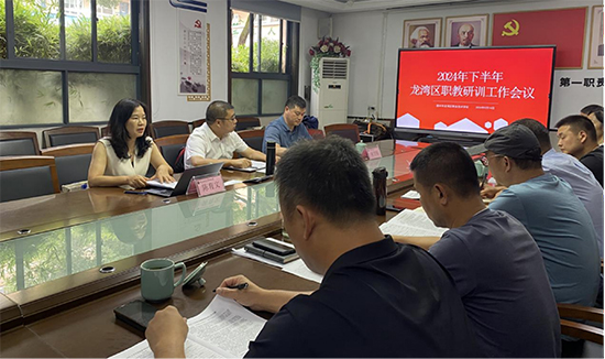 9月14日,2024年下半年區職教研訓工作會議在龍灣區職業技術學校瑤溪校區順利召開,龍灣區教師發展中心主任鄭忠勇,職教研訓科科長何衛標和研訓員陳育文蒞臨指導,布置本學期的研訓工作,學校行政班子及各學科教研組長、負責人出席本次會議。會議由何衛標主持。