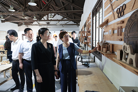 范曉春向調(diào)研組講述厚生絲廠悠久的歷史淵源,分享學校在歷史建筑保護與修繕方面的做法。在木作工坊,張東和與正在進行手工木工實訓的學生親切交談,深入了解學生課程內(nèi)容結(jié)構(gòu),關(guān)注學生課堂安排,并親切叮囑操作過程中注意安全。