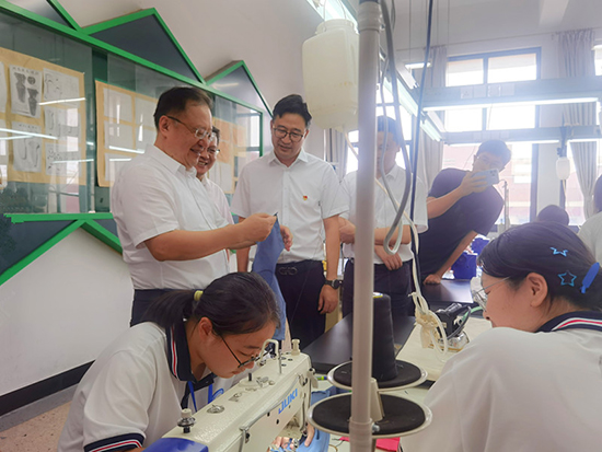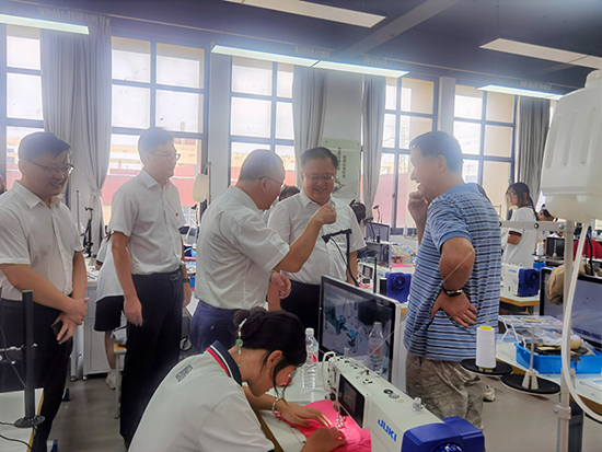 隨后,王濤一行考察了學(xué)校的一號(hào)實(shí)訓(xùn)樓。周國(guó)林書記介紹并陪同領(lǐng)導(dǎo)們先后走訪了服裝定制、3D數(shù)控、立體剪裁、數(shù)碼設(shè)計(jì)、染整及紡織實(shí)訓(xùn)室。在實(shí)訓(xùn)室內(nèi),領(lǐng)導(dǎo)們與正在操作的學(xué)生和教師親切交談,詳細(xì)了解教學(xué)情況及各專業(yè)的男女生比例,并觀看了學(xué)生們的精彩作品。學(xué)生們展示的精湛技藝和創(chuàng)新思維贏得了領(lǐng)導(dǎo)們的高度評(píng)價(jià)。