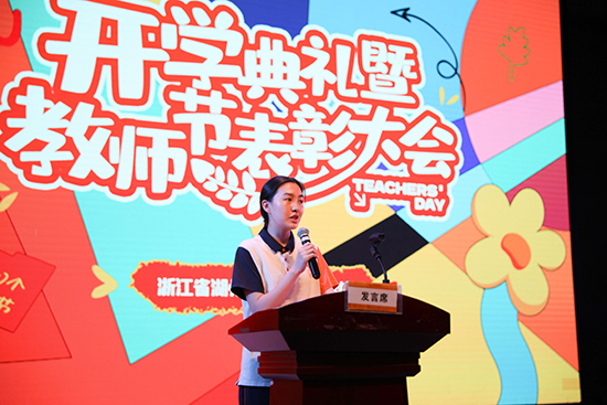一朝沐師恩,再踏新征程。2204班沈昕怡同學(xué)作為學(xué)生代表分享了她在專業(yè)學(xué)習(xí)、技能大賽等方面的成長故事,她感謝老師的指導(dǎo)與教誨,并送上了最真摯的教師節(jié)祝福,祝老師們節(jié)日快樂。