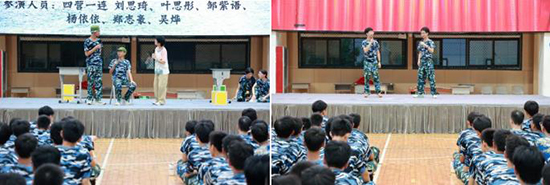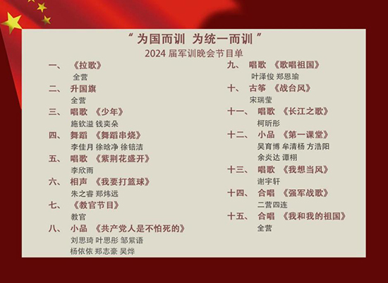 晚會的每一個節目都充滿了激情與創意,展現了當代青年的風采和愛國情懷。以傳統的拉歌比賽開場,同學們用嘹亮的歌聲和整齊的節奏,迅速點燃了現場的氣氛。歌聲中傳遞出的青春活力和團結精神,讓人感受到軍訓生活的獨特魅力。