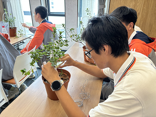 同學們走進碧云花園,跟著杜鵑花造型藝術非遺傳承人蔡海燕,學習設計杜鵑花造型。蔡老師講解并示范了杜鵑花造型技巧,從修剪到蟠扎,每一個步驟都充滿了匠心獨運。同學們專心致志聽講,紛紛動手實踐。