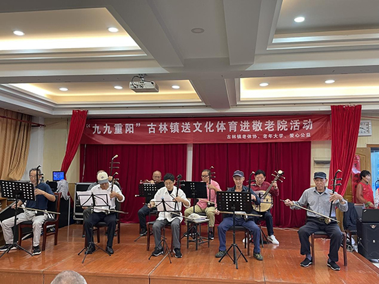 活動開始時,古林鎮老年大學太極拳班的學員們為老人們展示了老年26式楊式太極拳、觀音拳、功夫扇和木蘭扇等健身節目,并現場示范了一些簡單的伸展動作,如頸部伸展、肩部旋轉、手臂拉伸等。老人們認真跟著一起做動作,在溫暖親切的互動中,一起體驗運動的樂趣。接著,二胡班的學員們為老人們獻上了歌曲《十五的月亮》,他們的演奏技巧嫻熟,音色悠揚,讓老人們陶醉在音樂的海洋中。此外越劇班、甬劇班的學員們帶來了經典戲曲選段,他們唱腔婉轉,表演細膩。聽著熟悉的旋律,老人們興奮地一起揮舞著手中的小國旗,開心地跟著哼起了小調。