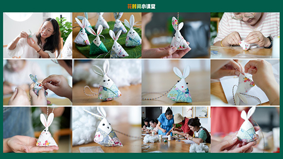 因為縫制經驗不足,過程中難免幾番出錯。有的把兔子耳朵縫反了,有的把兔子的身子縫成了正方形,有的在制作兔眼睛的時候出了錯……大家手上的功夫有些笨拙,臉上卻是一番笑意盈盈。出錯又有什么關系呢?拿著喜歡的布,挑選喜歡的線,放下浮躁,專注當下,心漸漸安靜,在一針一線間小兔慢慢有了屬于自己的模樣。