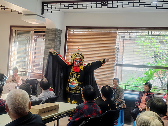 演出現場,來自安吉縣戲曲協會的表演者為馬家弄村老年學堂的學員們帶來了精彩的戲曲選段,其中有越劇《送鳳冠》《狀元組曲》,戲歌《探清水河》,川劇《變臉》等。演出中,中國傳統戲曲的唱、念、做、打,和曲詞、音樂、美術、表演的美熔鑄為一體,強烈的藝術感染力深深地吸引了老年學員們。演員們扎實的唱功和精彩的表演,更是得到了大家的一致好評,喝彩聲、鼓掌聲此起彼落,場上場下氣氛熱烈,讓老人們過足了戲癮。