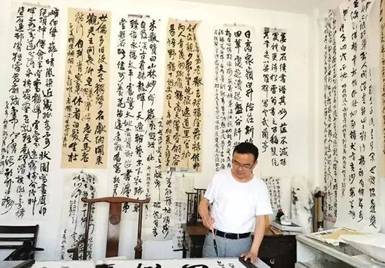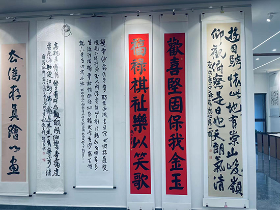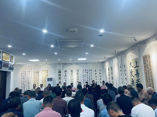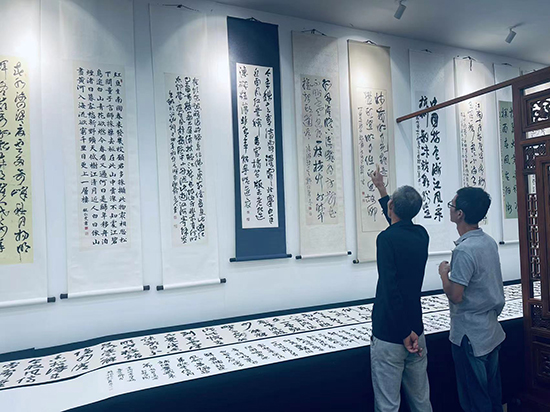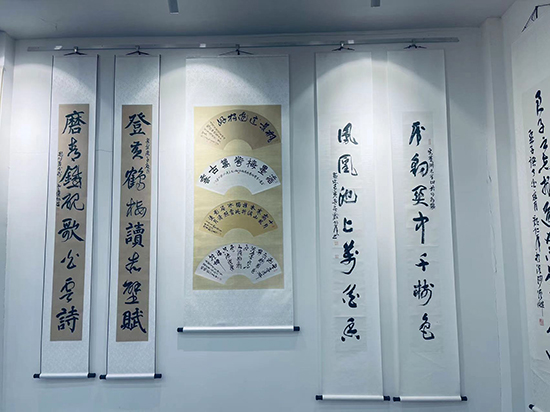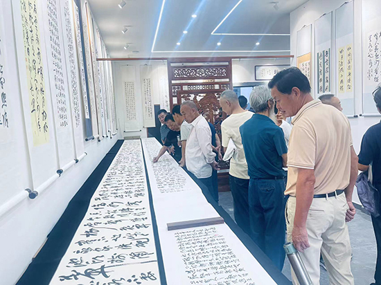 近200位來自諸暨市楓江書畫社、諸暨三賢研究會、諸暨市古越書畫院的社員和書法愛好者及親朋好友觀展,近距離欣賞魏仁虎的書法作品。四周墻壁上掛滿了大大小小尺幅、真草篆隸字體的100余幅多種形式的書法作品,條幅、楹聯(lián)、手卷、中堂、扇面、條屏等應(yīng)有盡有,或娟秀的小楷,或恢宏的大字或流暢的行書,滿眼是雅致的書墨氣息,讓人沉浸在粗細筆畫、輕重筆力、疏密空間、濃淡墨味的書法海洋中,尤其是一樓西側(cè)擺放在桌子上的兩幅長卷,吸引眾位圍觀賞鑒,對魏仁虎一氣呵成、大氣磅礴、老到嫻熟地書寫贊美有加。