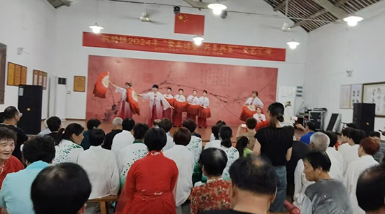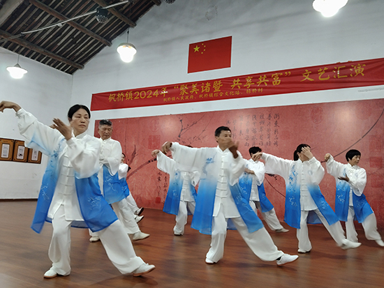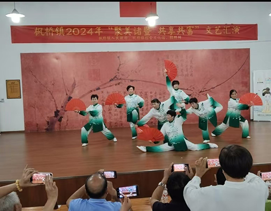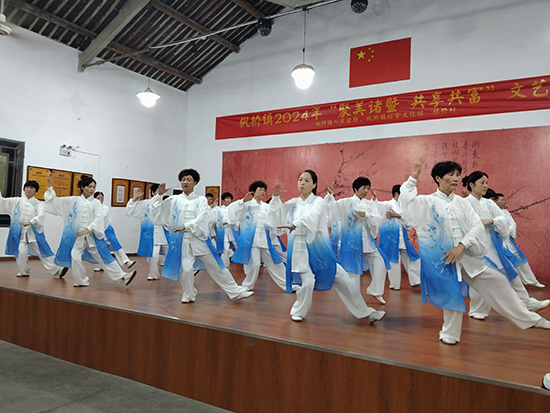 演出歷時兩個小時,共有舞蹈、太極拳、歌曲、越劇、樂器演奏等18個節目,諸暨市楓橋鎮人民政府主辦,楓橋鎮櫟橋村文化禮堂承辦,演員來自天竺社區、楓一社區、梅苑村等十多個村(社區)的文藝演出隊,近200位村民到場觀看。(孫文明)
