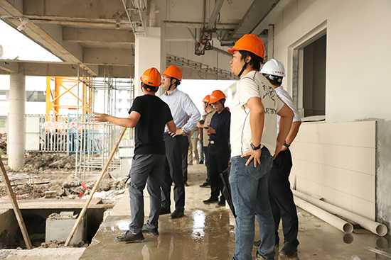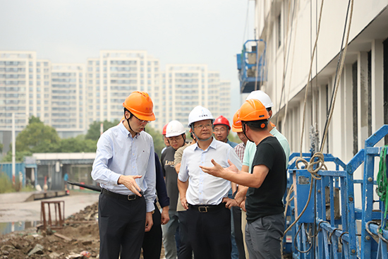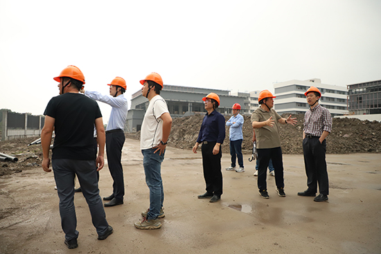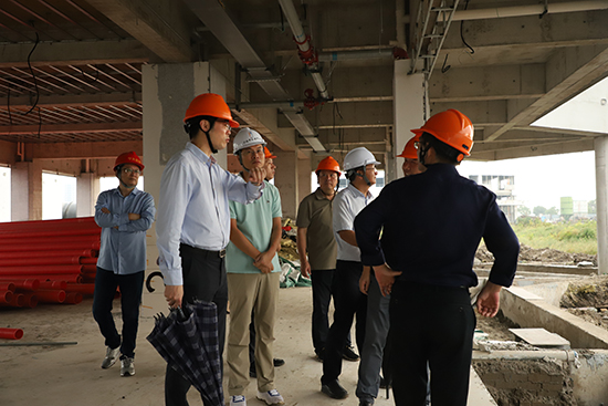 在鄞州職高黨委書記王志勇、校長張武劍、副校長邵忠芳等人的陪同下,王飛副局長一行實地查看了項目施工基建場地,詳細了解了各地塊項目建設推進情況,對新校區建設過程中遇到的問題提出了意見與建議。