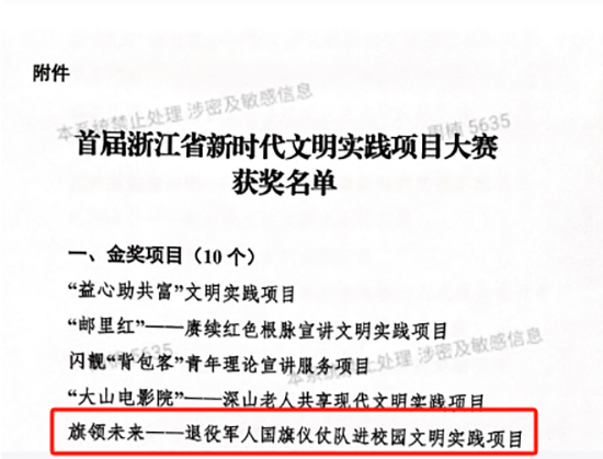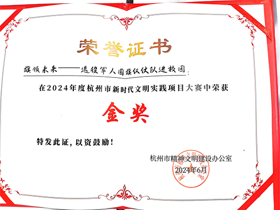 10月10日至11日,在第二屆浙江省退役軍人志愿服務項目大賽決賽中,由學校退役學生徐家樂、金宇昕、周稼明、馬森森參與的“西湖區‘旗領未來’退役軍人國旗儀仗隊進校園”項目在進入決賽的30個優秀項目中脫穎而出,榮獲金獎!這是該團隊繼獲得浙江省新時代文明實踐項目金獎,杭州市第二屆退役軍人志愿服務項目大賽金獎,2024年杭州市新時代文明實踐項目大賽金獎后,斬獲的第四個金獎。