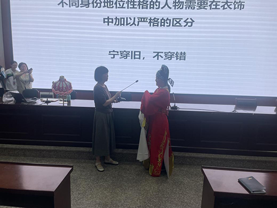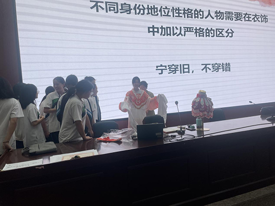 在講座中,李女士揭示了戲曲服裝制作的精細(xì)工藝。她介紹了戲服的面料選擇,如何根據(jù)不同角色的身份和性格挑選適合的絲綢、緞子等材質(zhì);講解了戲服上的刺繡工藝,還分享了戲服的裁剪和縫制技巧。講座的最后,同學(xué)們親自體驗(yàn)了戲服的穿戴,感受了從選材到成品過程中每一道工序的匠心獨(dú)運(yùn),深刻體會(huì)到了這一傳統(tǒng)技藝的魅力所在。這次體驗(yàn)不僅為同學(xué)們打開了了解非遺文化的大門,也在他們心中埋下了傳承和發(fā)揚(yáng)這一技藝的種子。