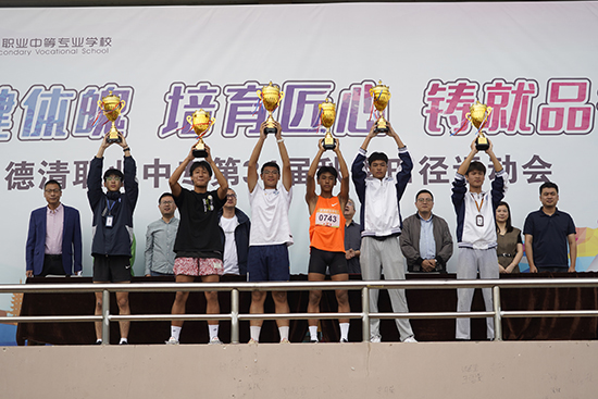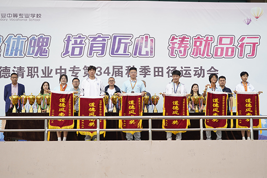 閉幕式上,總裁判長沈海彪宣讀各項比賽成績。本屆運動會共有70個班級參加,900多名運動員參賽,取得成績喜人,共有22個班集體榮獲團體獎,6個班級榮獲體育道德風尚獎。此外, 24機器人3+2班胡慶濤同學在高一男子跳高比賽、22數控2班男子4*400米接力比賽中分別打破學校最高紀錄。