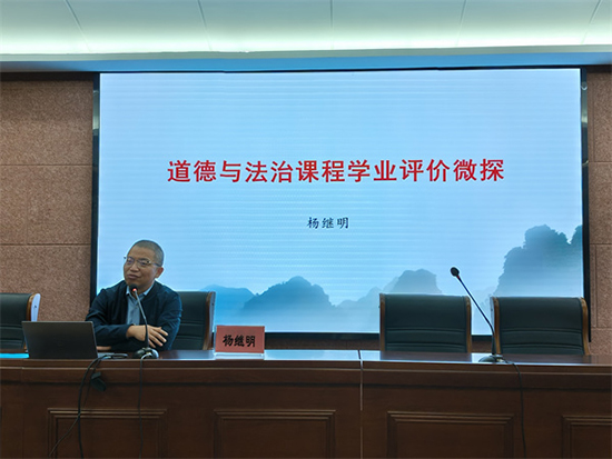 湖州市初中社會(huì)法治教研員楊繼明老師以《道德與法治課程學(xué)業(yè)評(píng)價(jià)微探》為題,為現(xiàn)場(chǎng)教師奉獻(xiàn)了一場(chǎng)內(nèi)容豐富、深入淺出的講座。他從新課標(biāo)的基本理念要求、新教材的總體特點(diǎn)思路展開,緊密結(jié)合教學(xué)一線實(shí)際需求,進(jìn)行了詳盡剖析。