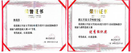 10月18日,為深入學習貫徹黨的二十屆三中全會、全國教育大會以及省委十五屆五次全會精神,進一步落實立德樹人根本任務,大力弘揚教育家精神,推進全省開大體系課程思政建設,推動教育教學創(chuàng)新發(fā)展,浙江開放大學舉辦全省開大體系教師教學創(chuàng)新與課程思政大賽決賽。柯橋學院教師林莉莎參加比賽并喜獲一等獎,學院喜獲優(yōu)秀組織獎。