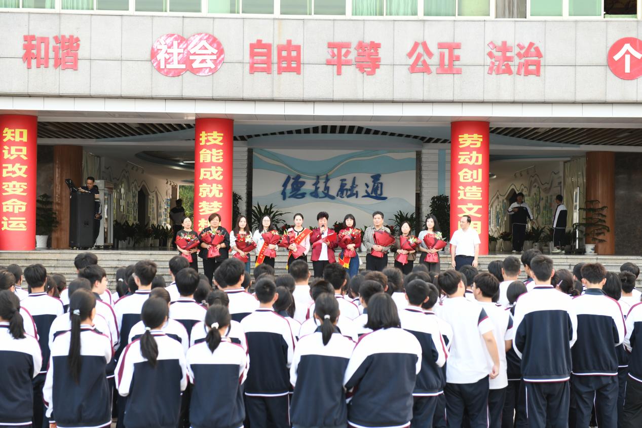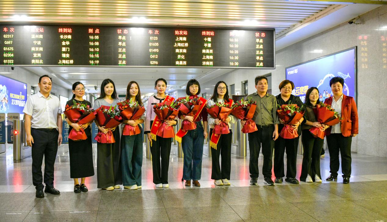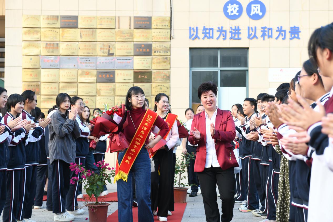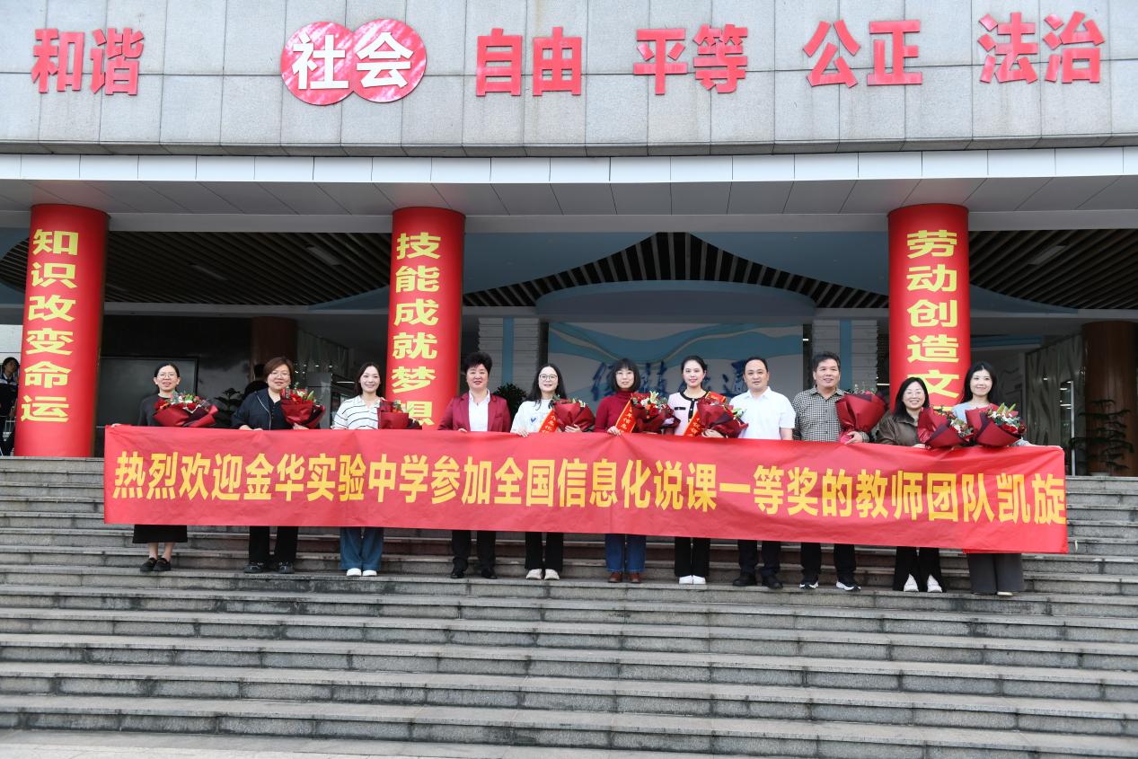 10月21日下午,參賽團隊載譽而歸,金華實驗中學為這些凱旋的老師們精心準備了簡短而莊重的歡迎儀式,給予他們崇高的禮遇。在金華高鐵站,俞書記親自為獲獎老師披上綬帶,并獻上鮮花,表達了由衷的敬意與祝福。在校內,師生們整齊列隊,熱烈歡迎他們的歸來。