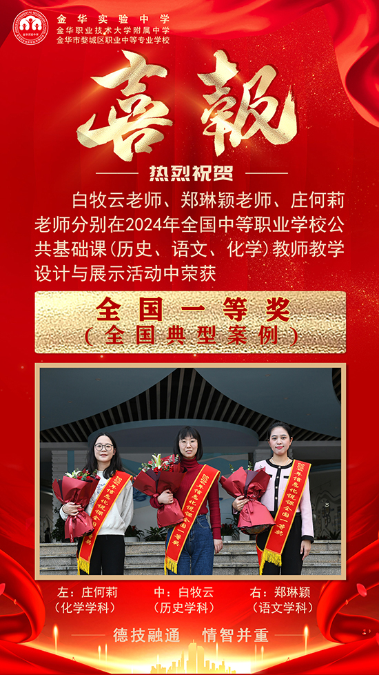 本次活動由教育部職業教育發展中心主辦、高等教育出版社承辦,來自全國各地區中職學校134名教師參加語文學科展示活動,101名教師參加歷史學科展示活動,54名教師參加化學學科展示活動。歷經層層選拔,金華實驗中學白牧云(歷史)、鄭琳穎(語文)、莊何莉(化學)老師代表浙江省出征,經過教學設計方案、教學課件、課堂實錄、微課、現場說課及答辯等環節的激烈角逐,在參賽選手中脫穎而出全部榮獲國賽一等獎,并入選全國中等職業學校公共基礎課教師教學設計典型案例,將在智慧職教平臺向全國職業院校交流展示。其中,白牧云老師更是作為全國一等獎第一名代表在閉幕式上進行了展示。