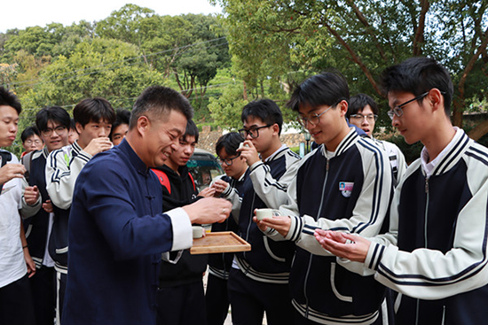 剛到基地,火山茶的工作人員給同學們端來了一杯杯迎客茶,讓同學們在火山茶的悠然茶香中走進“茶”的世界。