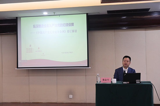 26日上午,鄞州職高邀請了寧波市委黨校政法教研部慕金付副教授為黨員教師帶來了以“縱深推進(jìn)全面從嚴(yán)治黨的紀(jì)律保障”為主題的《中國共產(chǎn)黨紀(jì)律處分條例》修訂解讀課。慕金付副教授圍繞修訂條例的背景意義、條例修訂的內(nèi)容特點、新條例的學(xué)習(xí)貫徹三個方面進(jìn)行黨建經(jīng)驗分享,通過多項案例分析,精到地為大家分析了紀(jì)律處分條例的內(nèi)容體系,要求黨員教師始終嚴(yán)格要求自己,知敬畏、存戒懼、守底線,嚴(yán)明守紀(jì),紀(jì)律自覺,讓全體老師深受感觸。