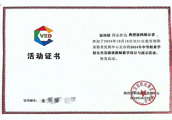 近日,由教育部職業(yè)教育發(fā)展中心主辦的2024年中等職業(yè)學(xué)校公共基礎(chǔ)課教師教學(xué)設(shè)計(jì)與展示交流活動(dòng)在西安落下帷幕,全國(guó)共有1000多名教師參加展示活動(dòng)。衢州第二中等專業(yè)學(xué)校徐祎婧老師在133位選手參加的思想政治組教學(xué)設(shè)計(jì)展示中表現(xiàn)優(yōu)異,獲得評(píng)委的一致好評(píng),其參賽作品入選全國(guó)中等職業(yè)學(xué)校公共基礎(chǔ)課教師教學(xué)設(shè)計(jì)典型示范案例(一等獎(jiǎng))。
