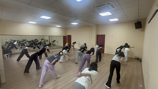 開班儀式結束后,學員們正式開始上課。在瑜伽課的教室里,學員們身著整潔舒適的瑜伽服,跟隨老師學習瑜伽運動。如同一幅緩緩展開的畫卷,將人與自然、內在與外在的和諧之美,細膩而深刻地勾勒在每一寸空間與時間之中。