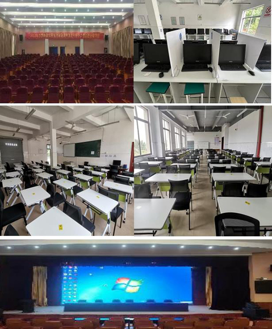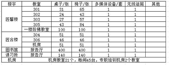學校共有專用多媒體培訓教室12個,其中200人以上多功能培訓教室5個,機房21個,共計電腦1050臺,其中專職培訓機房2個,同時可開展10個班次培訓。