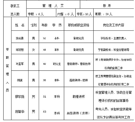 有專職管理人員6人,內督導6人。有專兼職教師60余人。教師全部以高級職稱、高級技師為主,同時長期聘請各大科研院所、企業、高校經驗豐富的企業管理人員、能工巧匠和教師來校參與社會培訓服務。
